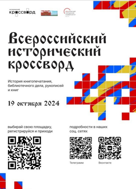В Москве началась регистрация участников VI просветительской акции «Всероссийский исторический кроссворд». Она пройдет 19 октября 2024 года в 71 регионе России на рекордном количестве площадок – 460. В этом году кроссворд посвящен истории книгопечатания, библиотечного дела, рукописям и книгам.