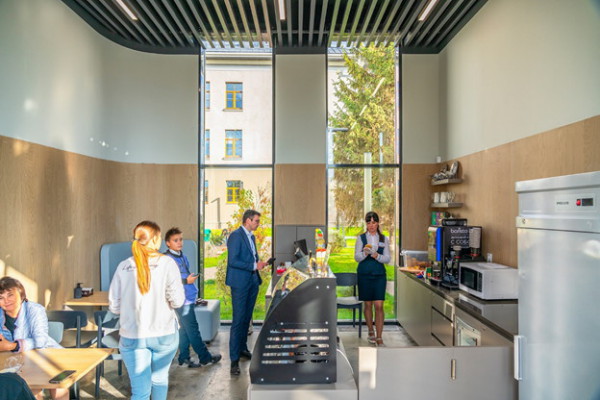 Всё это в прошлом, потому что теперь у них есть возможность, не проходя на территорию школы, провести время в уютном помещении, выпить чашку кофе с круассаном, а заодно заняться полезными делами: повырезать снежинки для школьной новогодней ёлки или заполнить анкету.