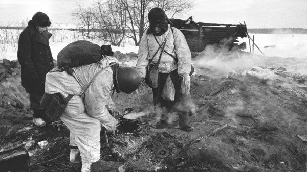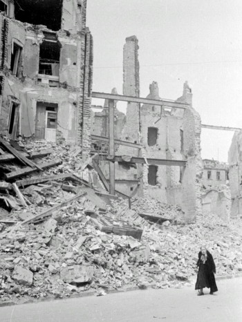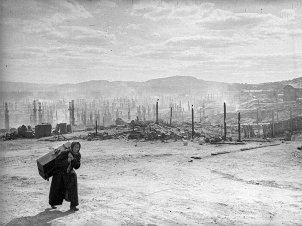 В июне 1942 года фашисты решили сжечь Мурманск дотла. В огне гибли люди, дома. Тогда я встретил там старую женщину. Она несла деревянный чемодан – всё, что осталось от домашнего очага. Я сфотографировал её. Женщина опустила свой чемодан, присела на него и с укоризной говорит: «Что ж ты, сынок, фотографируешь мое горе, наше несчастье? Вот если б сфотографировал, как наши бомбят Германию!» Мне стало неловко. «Да, мамаша, – сказал я, – вы правы, конечно. Но, наверное, доведется сделать и такой снимок». Прошло еще три года войны, и в мае 1945 года на улицах Берлина среди руин я увидел старую женщину – и вспомнил ту, в Мурманске, и тот разговор. Я подошел к немецкой женщине, спросил, кто она и куда идет. Она ответила: «Я уже не знаю, кто я и куда иду, и ничего у меня не осталось, кроме того, что на мне… А был дом, и семья была. Все это было. А теперь нет ничего». Потом, прощаясь, спросила: «Зачем война? Зачем все это нужно было?», – Евгений Халдей.