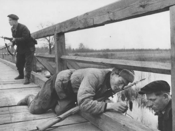 Михаил Трахман. Белорусские партизаны взрывают мост, 1943 год. Ленинградские партизаны на марше, 1942 год. Партизанская атака, 1941 год