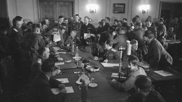 В годы войны Георгий Петрусов работал фотокорреспондентом Совинформбюро и газеты «Известия». В апреле 1945 года с передовыми войсками вошел в Берлин. Фотографию он сделал в последний день войны. На снимке – германское командование во главе с генерал-фельдмаршалом Кейтелем, маршал Советского Союза Георгий Жуков, главный маршал авиации Великобритании Артур Уильям Теддер и другие. Георгий Петрусов снял это историческое событие и его участников с разных ракурсов. В небольшом помещении офицерского клуба в Карлсхорсте собралось много людей. Чтобы сделать эффектный кадр, в который бы поместились все основные действующие лица и журналисты, фотографу пришлось влезть на стол. На эту мысль его навел довоенный опыт: Петрусов всюду возил с собой небольшую лестницу-стремянку.
