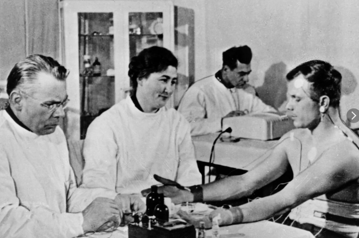 Ю.А. Гагарин на процедуре медицинского обследования. На втором плане предположительно Ф.Д. Горбов.