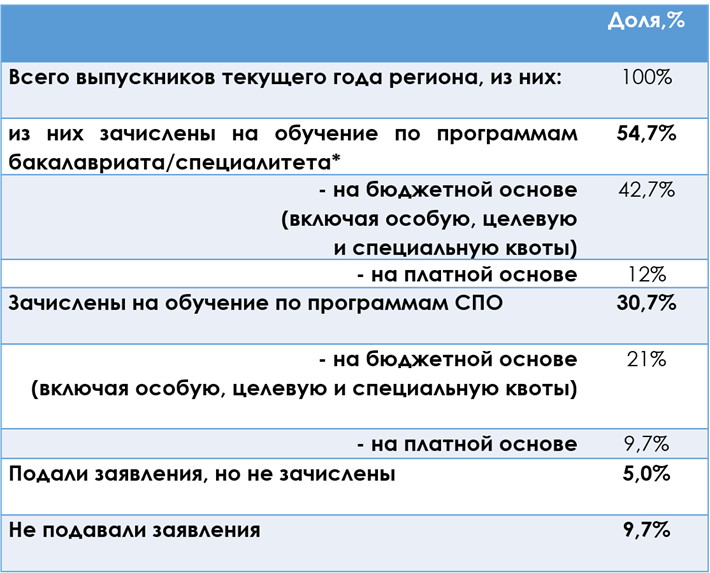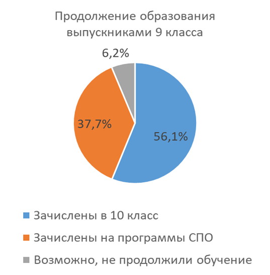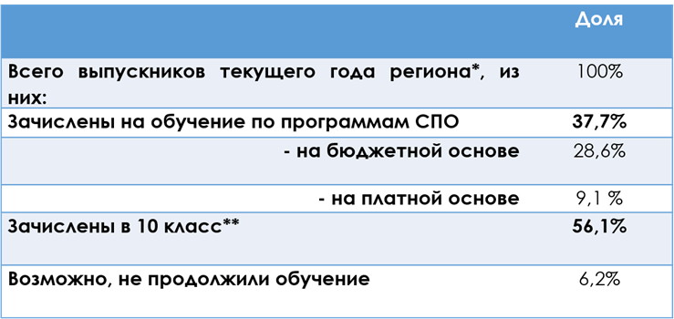 Исследование, основанное на данных одного из субъектов Российской Федерации, где когорта учащихся 9-х классов в 2022 году составила примерно 10 тысяч человек, отразила общероссийские тенденции в части динамики распределения выпускников по окончании основной школы. Так, число поступающих в 10-й класс уменьшается с каждым годом. Если несколько лет тому назад эта категория в данном регионе составляла порядка 63%, то в 2023 году – 56%. В то же время растет доля зачисленных в СПО, и такая динамика прогнозируется в ближайшем будущем.