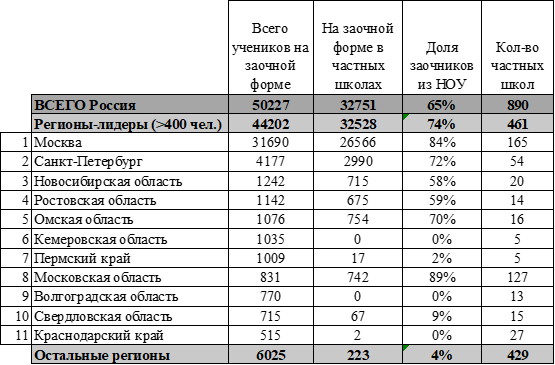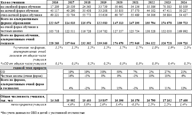 Помимо семейной формы образования, важны и другие индикаторы альтернативного образования, отличного от очной учебы в государственных школах: заочная и очно-заочные формы (в частных и госшколах) и очное обучение в негосударственных образовательных учреждениях (НОУ).