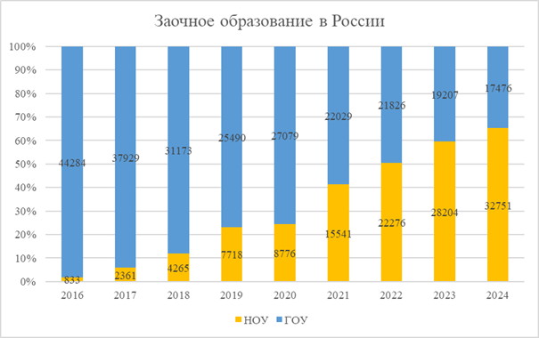В период с 2016 по 2019 годы количество заочников сократилось на четверть, затем наблюдался рост и к 2023 году численность заочников превысила показатель 2016 года. В 2024 году – учеников на заочной форме образования уже 50000. Однако эти цифры ничего не говорят о тенденциях в образовании, если не посмотреть их в разбивке на частные и государственные школы. Так, частное образование в заочной форме выросло в 39 раз, а госшколы потеряли 60% своих заочников.