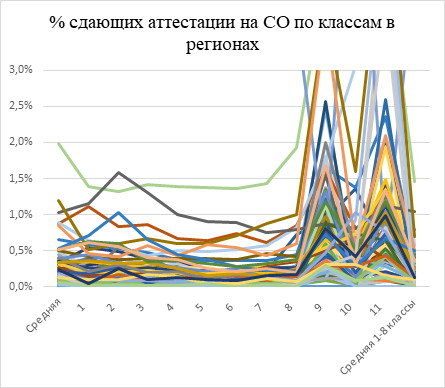 В среднем по России на СО проходят аттестации 0,5% от общего количества учеников школ (на всех формах обучения: очной, заочной и очно-заочной), в 9 и 11 классах – эти показатели значительно выше в абсолютном большинстве регионов (1,1% и 1,6% соответственно). Если экстраполировать показатели 9 класса на более младшие, то оценочная численность детей на СО может составить 174 000 детей (или 196 000, если использовать специфику каждого региона).